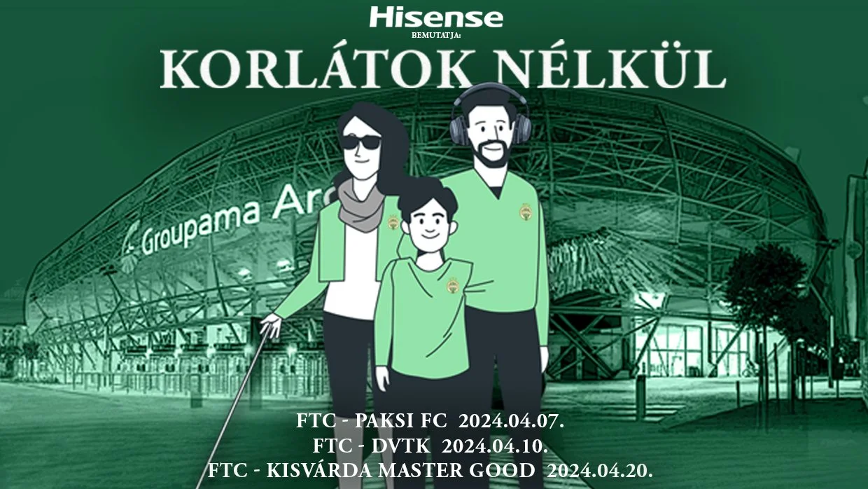 A Ferencvárosi Torna Club és a SPORTFIVE egyaránt hosszú ideje elkötelezett a társadalmi felelősségvállalás iránt. Feladatunknak érezzük, hogy felhívjuk a közvélemény figyelmét az akadályozottsággal élő társadalmi csoportok helyzetére. Emellett szeretnénk segíteni a társadalomba való teljesebb értékű beilleszkedésüket. Éppen ezért a 2024 áprilisában rendezett hazai bajnoki mérkőzéseinket a Hisense segítségével akadálymentesítjük, ezáltal elérhetővé tesszük számukra a mérkőzéslátogatás élményét. A Hisense-szel közösen meghirdetett akciónk során az autizmussal élők, a vakok és gyengénlátók, valamint a végtaghiányos, mozgásukban akadályozott személyeket szeretnénk maradandó meccsnapi élményben részesíteni. Az autista szurkolóink számára zajvédő fülhallgatót, valamint sötétített szemüveget, míg látássérült szurkolónk számára audio-narrációs eszközt biztosítunk a zavartalan mérkőzésélmény érdekében. Az április bajnoki összecsapások mindegyikén 100 főt tudunk vendégül látni.